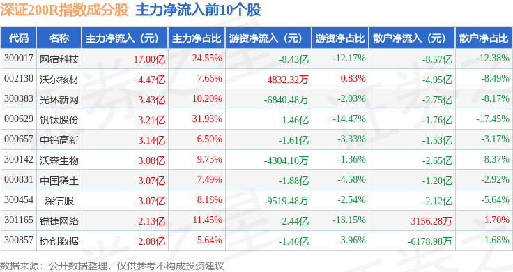 资金流向方面,深证200R(399679)指数成份股当日主力资金净流出合计132.1亿元,游资资金净流入合计24.73亿元,散户资金净流入合计107.37亿元。成份股资金流向详情见下表: