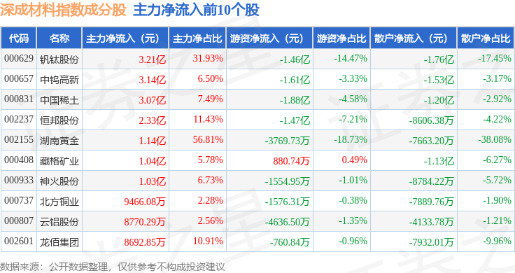 资金流向方面,深成材料(399681)指数成份股当日主力资金净流出合计15.14亿元,游资资金净流出合计2.81亿元,散户资金净流入合计17.95亿元。成份股资金流向详情见下表: