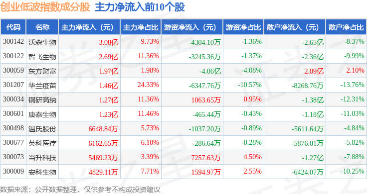 资金流向方面,创业低波(399692)指数成份股当日主力资金净流出合计31.08亿元,游资资金净流入合计10.71亿元,散户资金净流入合计20.37亿元。成份股资金流向详情见下表: