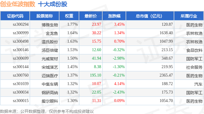 证券之星消息,1月26日,创业低波(399692)指数报收于4231.49点,跌0.94%,成交990.34亿元,换手率3.41%。当日该指数成份股中,上涨的有29家,华兰疫苗以20.0%的涨幅领涨,下跌的有70家,帝尔激光以11.26%的跌幅领跌。