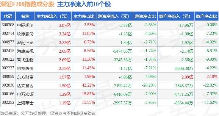 资金流向方面,深证F200(399703)指数成份股当日主力资金净流出合计171.23亿元,游资资金净流入合计19.54亿元,散户资金净流入合计151.69亿元。成份股资金流向详情见下表: