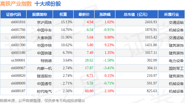 高铁产业(399807)指数十大成份股详情如下: