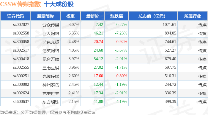 资金流向方面,CSSW传媒(399810)指数成份股当日主力资金净流出合计50.37亿元,游资资金净流入合计17.67亿元,散户资金净流入合计32.7亿元。成份股资金流向详情见下表:
