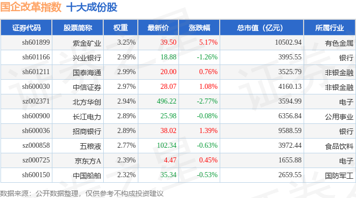 国企改革(399974)指数十大成份股详情如下: