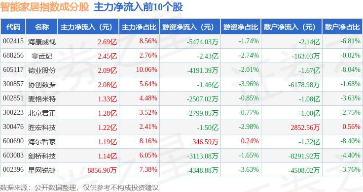 资金流向方面,智能家居(399996)指数成份股当日主力资金净流出合计125.08亿元,游资资金净流入合计35.13亿元,散户资金净流入合计89.94亿元。成份股资金流向详情见下表: