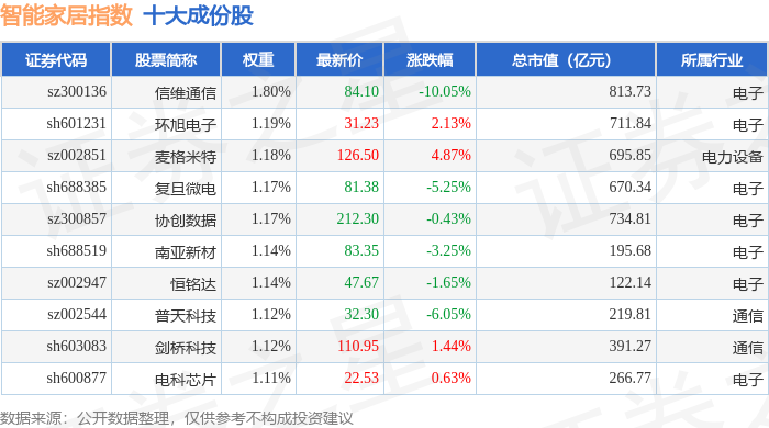智能家居(399996)指数十大成份股详情如下: