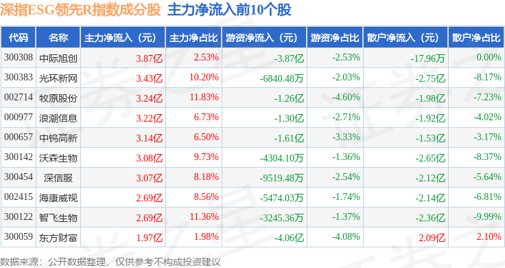 资金流向方面,深指ESG领先R(470029)指数成份股当日主力资金净流出合计178.73亿元,游资资金净流入合计33.4亿元,散户资金净流入合计145.33亿元。成份股资金流向详情见下表: