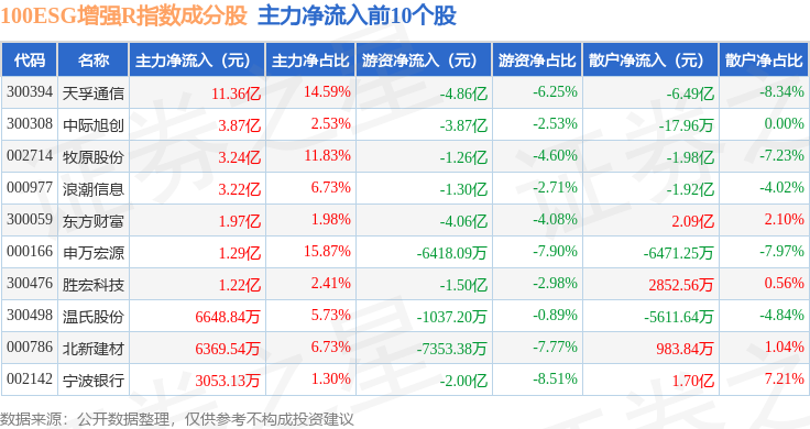 资金流向方面,100ESG增强R(470033)指数成份股当日主力资金净流出合计52.43亿元,游资资金净流出合计13.4亿元,散户资金净流入合计65.82亿元。成份股资金流向详情见下表: