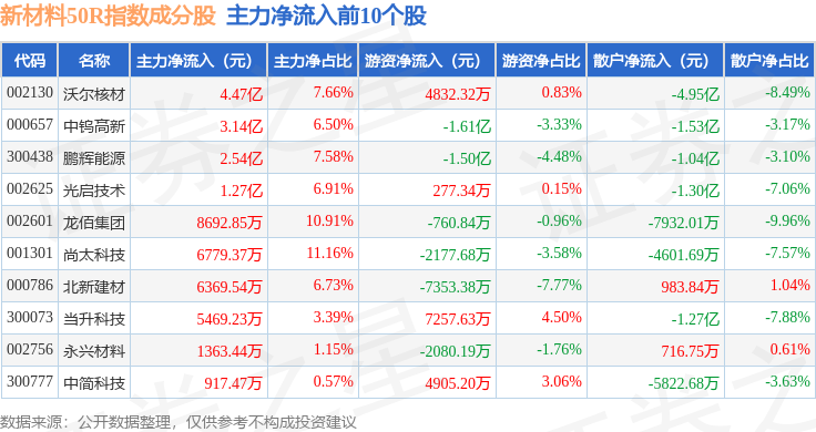资金流向方面,新材料50R(470042)指数成份股当日主力资金净流出合计51.37亿元,游资资金净流入合计11.62亿元,散户资金净流入合计39.75亿元。成份股资金流向详情见下表: