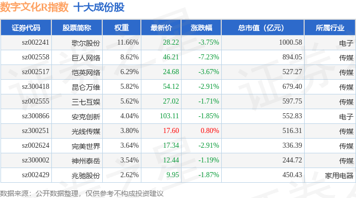 资金流向方面,数字文化R(470047)指数成份股当日主力资金净流出合计31.23亿元,游资资金净流入合计12.02亿元,散户资金净流入合计19.21亿元。成份股资金流向详情见下表: