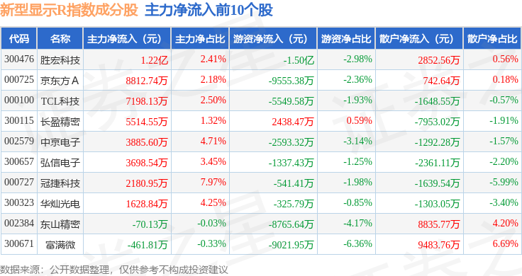 资金流向方面,新型显示R(470048)指数成份股当日主力资金净流出合计47.76亿元,游资资金净流入合计11.43亿元,散户资金净流入合计36.33亿元。成份股资金流向详情见下表: