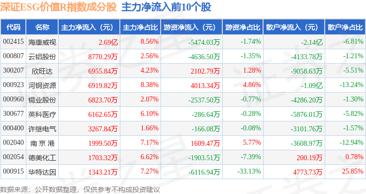资金流向方面,深证ESG价值R(470061)指数成份股当日主力资金净流出合计84.02亿元,游资资金净流入合计18.83亿元,散户资金净流入合计65.19亿元。成份股资金流向详情见下表: