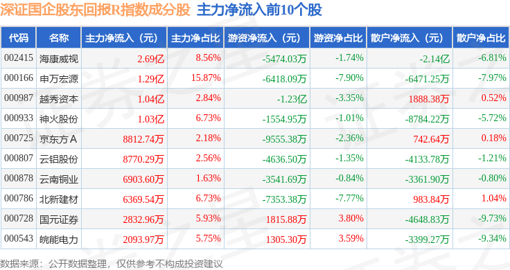 资金流向方面,深证国企股东回报R(470064)指数成份股当日主力资金净流出合计20.95亿元,游资资金净流入合计2.53亿元,散户资金净流入合计18.41亿元。成份股资金流向详情见下表: