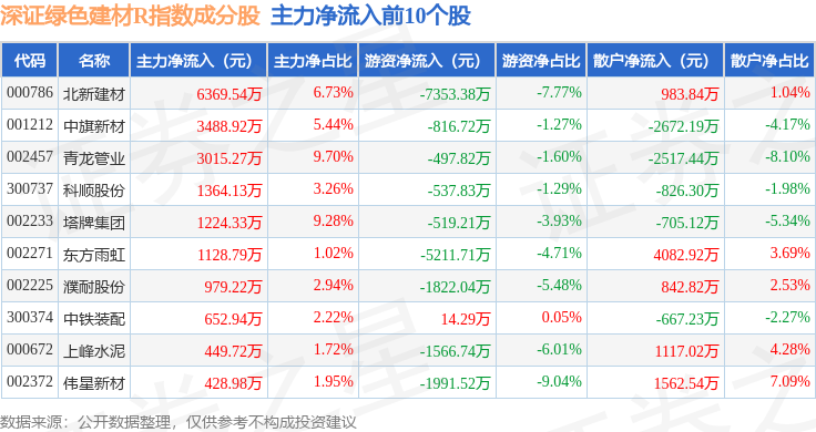 资金流向方面,深证绿色建材R(470077)指数成份股当日主力资金净流出合计2.78亿元,游资资金净流出合计1.02亿元,散户资金净流入合计3.8亿元。成份股资金流向详情见下表: