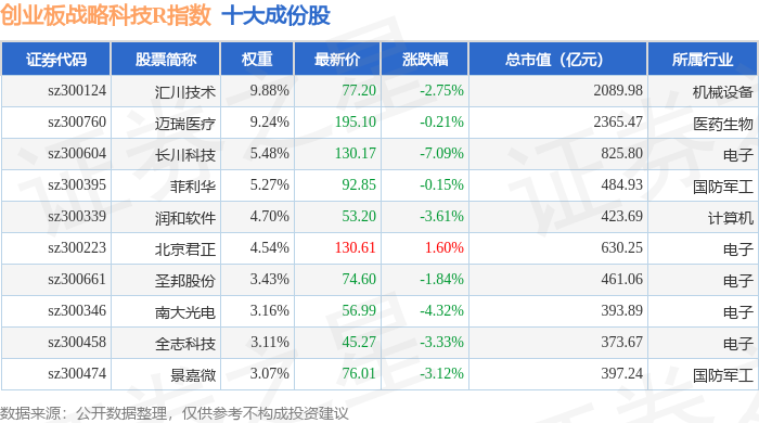 创业板战略科技R(471004)指数十大成份股详情如下: