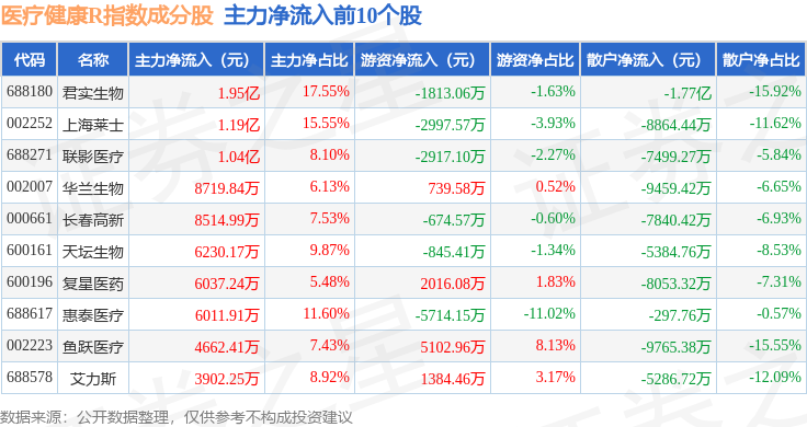 资金流向方面,医疗健康R(480016)指数成份股当日主力资金净流入合计4.04亿元,游资资金净流出合计2.86亿元,散户资金净流出合计1.18亿元。成份股资金流向详情见下表: