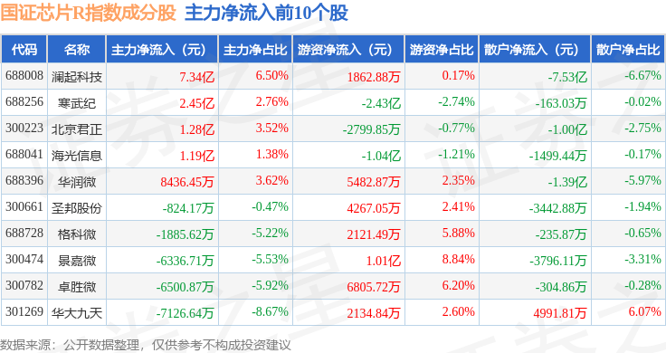 资金流向方面,国证芯片R(480017)指数成份股当日主力资金净流出合计59.56亿元,游资资金净流入合计31.58亿元,散户资金净流入合计27.98亿元。成份股资金流向详情见下表: