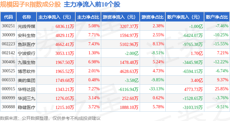 资金流向方面,规模因子R(480055)指数成份股当日主力资金净流出合计18.11亿元,游资资金净流入合计2.13亿元,散户资金净流入合计15.98亿元。成份股资金流向详情见下表:
