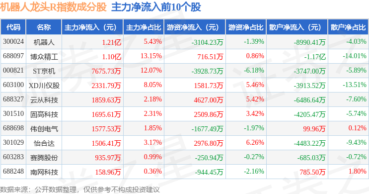资金流向方面,机器人龙头R(480071)指数成份股当日主力资金净流出合计37.84亿元,游资资金净流入合计13.43亿元,散户资金净流入合计24.41亿元。成份股资金流向详情见下表: