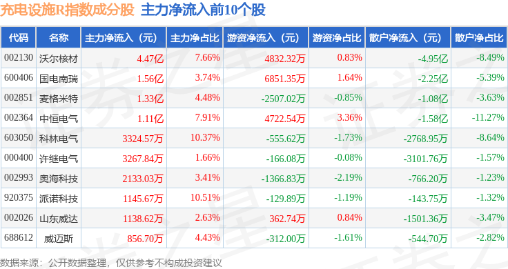 资金流向方面,充电设施R(480077)指数成份股当日主力资金净流出合计9.25亿元,游资资金净流入合计6.05亿元,散户资金净流入合计3.08亿元。成份股资金流向详情见下表: