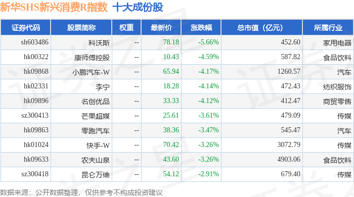 新华SHS新兴消费R(489006)指数十大成份股详情如下: