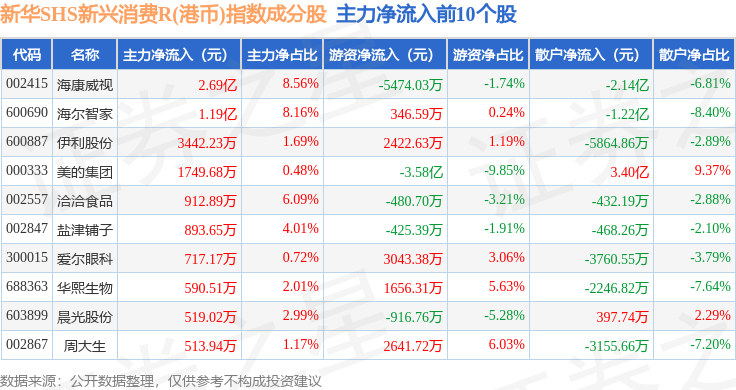 资金流向方面,新华SHS新兴消费R(港币)(489007)指数成份股当日主力资金净流出合计14.3亿元,游资资金净流入合计1984.84万元,散户资金净流入合计14.11亿元。成份股资金流向详情见下表: