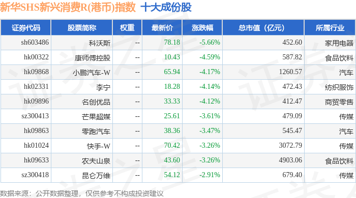 新华SHS新兴消费R(港币)(489007)指数十大成份股详情如下: