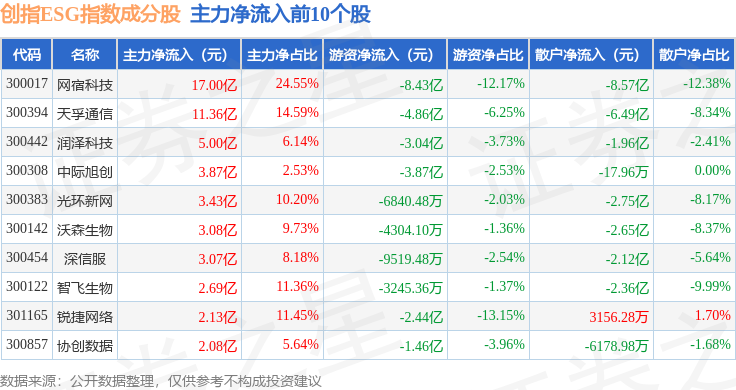 资金流向方面,创指ESG(970028)指数成份股当日主力资金净流出合计59.2亿元,游资资金净流入合计9.81亿元,散户资金净流入合计49.39亿元。成份股资金流向详情见下表: