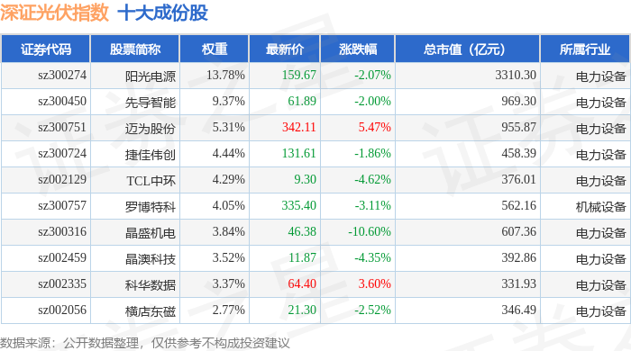 证券之星消息,1月26日,深证光伏(970035)指数报收于4484.73点,跌1.22%,成交956.52亿元,换手率7.23%。当日该指数成份股中,上涨的有12家,晓程科技以20.01%的涨幅领涨,下跌的有37家,帝尔激光以11.26%的跌幅领跌。