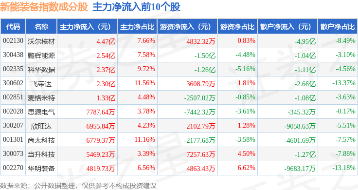 资金流向方面,新能装备(970043)指数成份股当日主力资金净流出合计71.53亿元,游资资金净流入合计30.58亿元,散户资金净流入合计40.95亿元。成份股资金流向详情见下表: