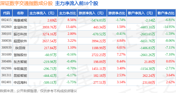 资金流向方面,深证数字交通(970049)指数成份股当日主力资金净流出合计29.26亿元,游资资金净流入合计9.43亿元,散户资金净流入合计19.83亿元。成份股资金流向详情见下表: