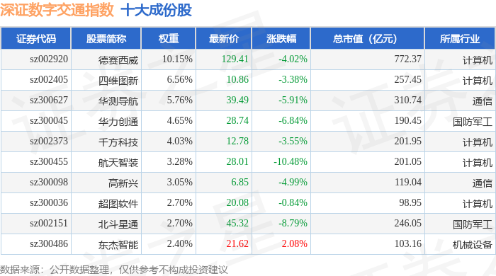 深证数字交通(970049)指数十大成份股详情如下: