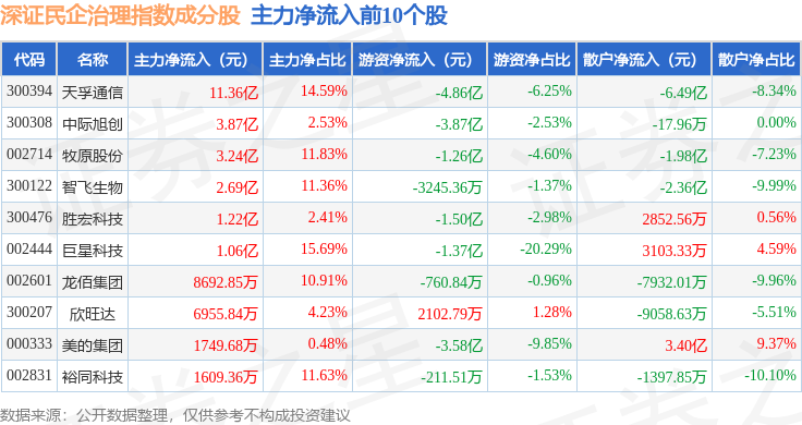 资金流向方面,深证民企治理(970058)指数成份股当日主力资金净流出合计79.94亿元,游资资金净流入合计3.07亿元,散户资金净流入合计76.87亿元。成份股资金流向详情见下表: