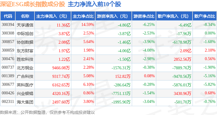 资金流向方面,深证ESG成长(970060)指数成份股当日主力资金净流出合计18.35亿元,游资资金净流出合计12.01亿元,散户资金净流入合计30.35亿元。成份股资金流向详情见下表: