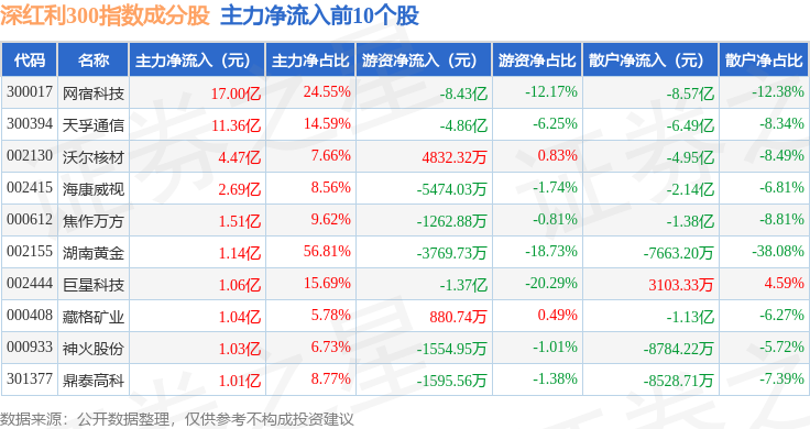 资金流向方面,深红利300(970062)指数成份股当日主力资金净流出合计151.43亿元,游资资金净流入合计37.04亿元,散户资金净流入合计114.39亿元。成份股资金流向详情见下表: