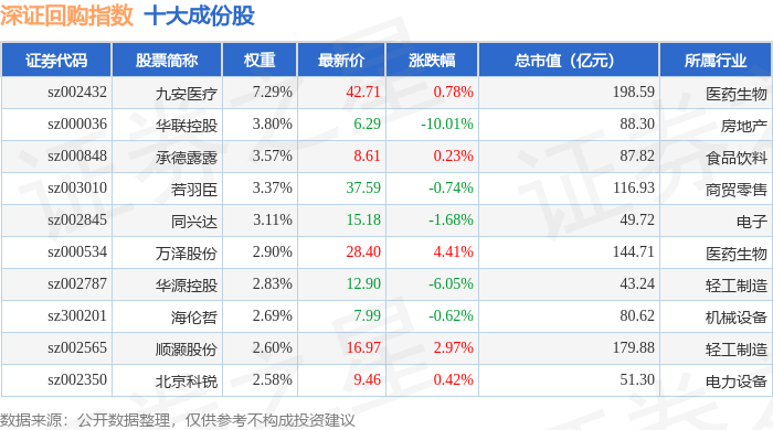 证券之星消息,1月26日,深证回购(970063)指数报收于3213.66点,跌1.06%,成交768.66亿元,换手率2.86%。当日该指数成份股中,上涨的有22家,万泽股份以4.41%的涨幅领涨,下跌的有27家,华联控股以10.01%的跌幅领跌。