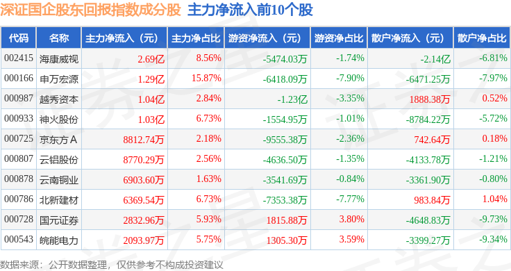 资金流向方面,深证国企股东回报(970064)指数成份股当日主力资金净流出合计20.95亿元,游资资金净流入合计2.53亿元,散户资金净流入合计18.41亿元。成份股资金流向详情见下表: