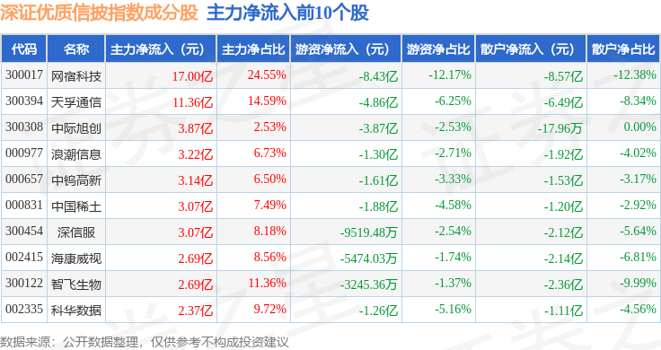 资金流向方面,深证优质信披(970065)指数成份股当日主力资金净流出合计284.81亿元,游资资金净流入合计56.79亿元,散户资金净流入合计228.01亿元。成份股资金流向详情见下表: