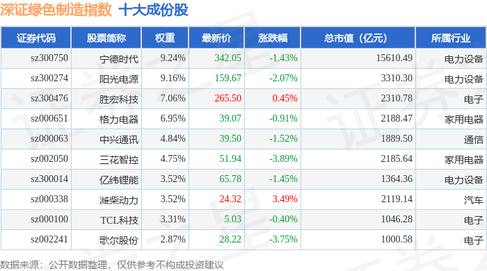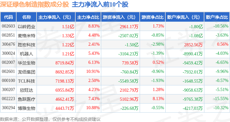 资金流向方面,深证绿色制造(970069)指数成份股当日主力资金净流出合计142.68亿元,游资资金净流入合计37.12亿元,散户资金净流入合计105.56亿元。成份股资金流向详情见下表:
