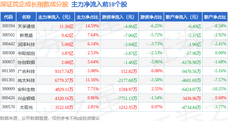 资金流向方面,深证民企成长(970071)指数成份股当日主力资金净流出合计33.89亿元,游资资金净流出合计4.15亿元,散户资金净流入合计38.04亿元。成份股资金流向详情见下表: