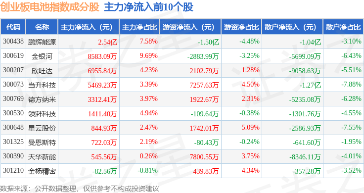 资金流向方面,创业板电池(970081)指数成份股当日主力资金净流出合计32.89亿元,游资资金净流入合计12.46亿元,散户资金净流入合计20.42亿元。成份股资金流向详情见下表: