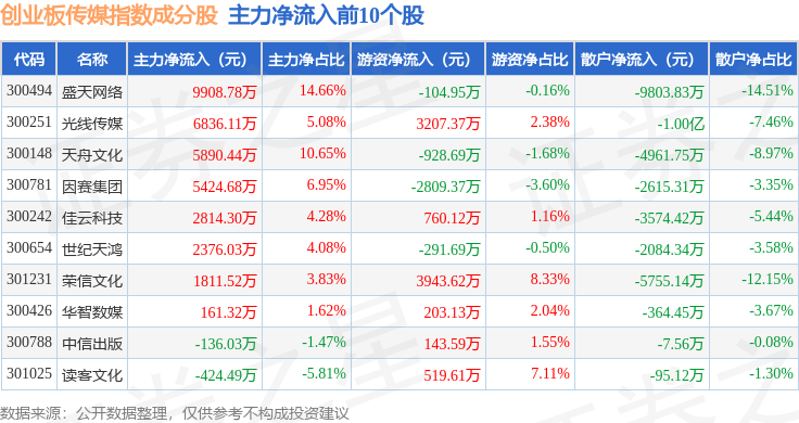 资金流向方面,创业板传媒(970084)指数成份股当日主力资金净流出合计24.85亿元,游资资金净流入合计10.54亿元,散户资金净流入合计14.31亿元。成份股资金流向详情见下表: