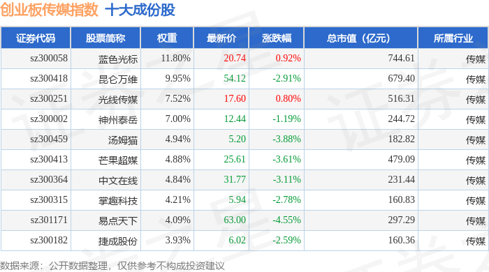 创业板传媒(970084)指数十大成份股详情如下: