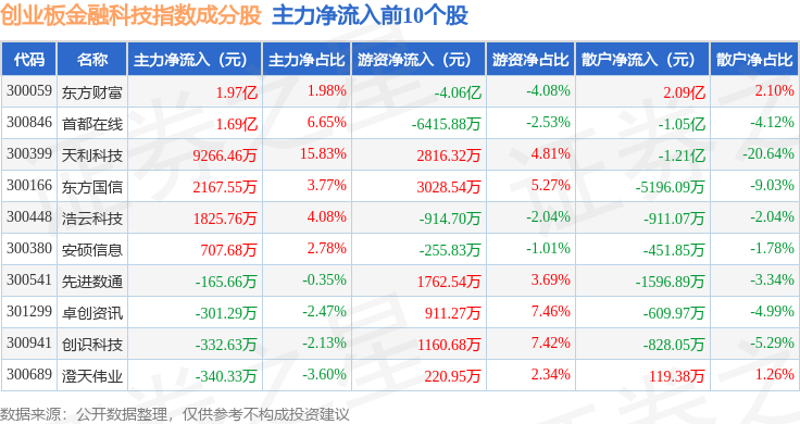 资金流向方面,创业板金融科技(970085)指数成份股当日主力资金净流出合计21.48亿元,游资资金净流入合计2.81亿元,散户资金净流入合计18.67亿元。成份股资金流向详情见下表: