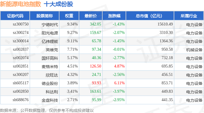 新能源电池(980027)指数十大成份股详情如下: