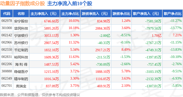 资金流向方面,动量因子(980057)指数成份股当日主力资金净流出合计25.49亿元,游资资金净流入合计6.99亿元,散户资金净流入合计18.5亿元。成份股资金流向详情见下表: