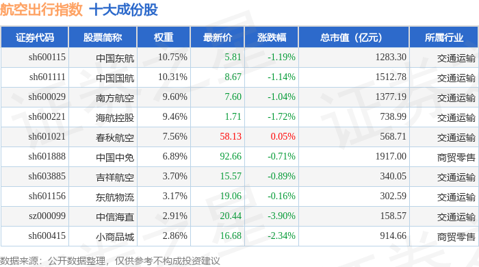 航空出行(980059)指数十大成份股详情如下: