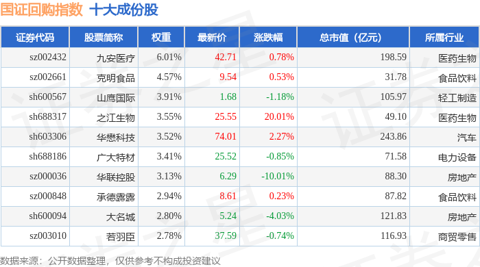国证回购(980063)指数十大成份股详情如下: