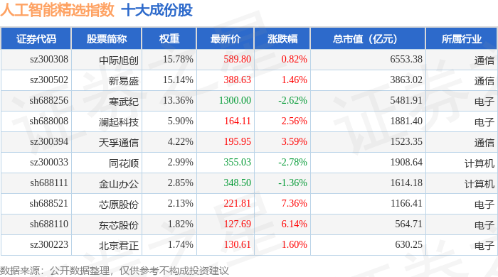 人工智能精选(980087)指数十大成份股详情如下: