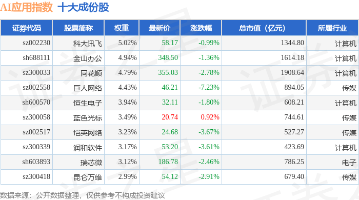 AI应用(980112)指数十大成份股详情如下: